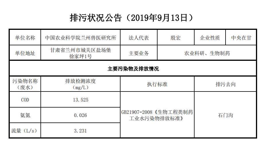 2019年9月13日污水排放监测数据公告