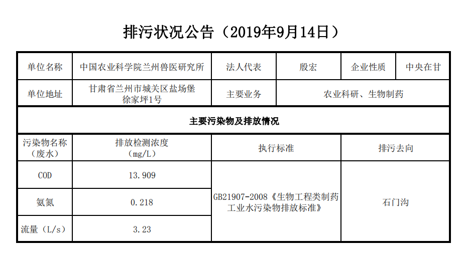 2019年9月14日污水排放监测数据公告