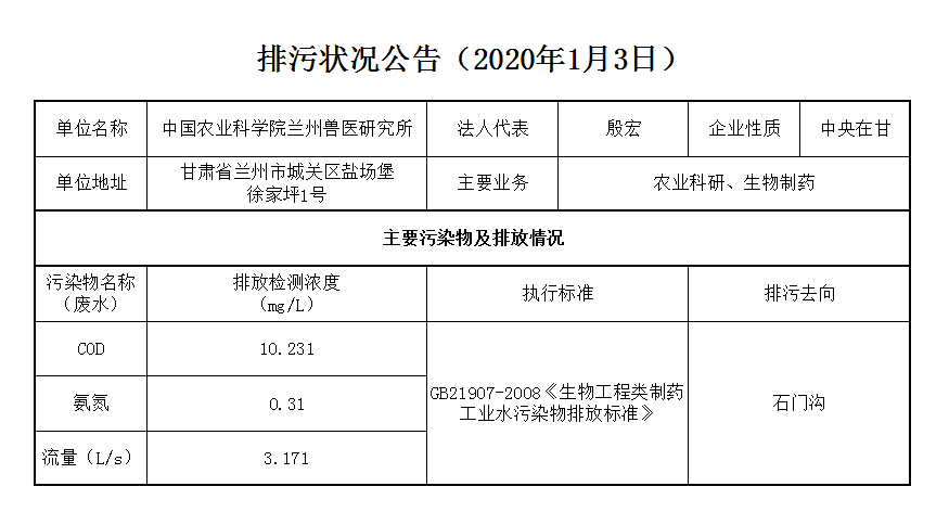 2020年1月3日污水排放监测数据公告