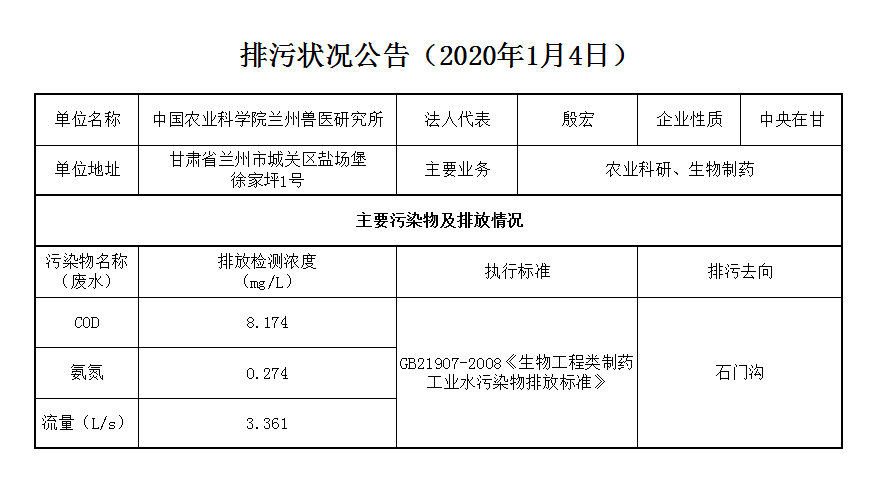 2020年1月4日污水排放监测数据公告