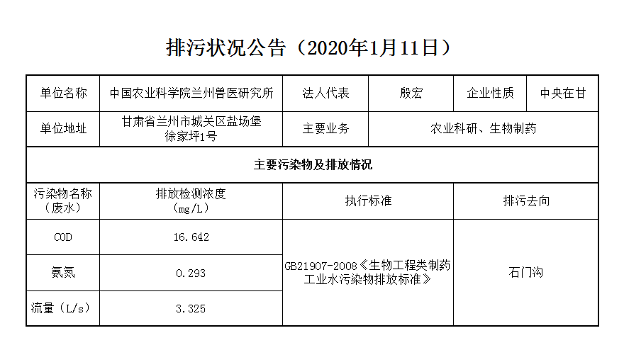 2020年1月11日污水排放监测数据公告