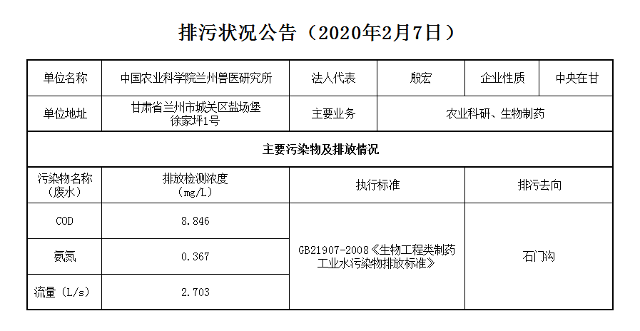 2020年2月7日污水排放监测数据公告