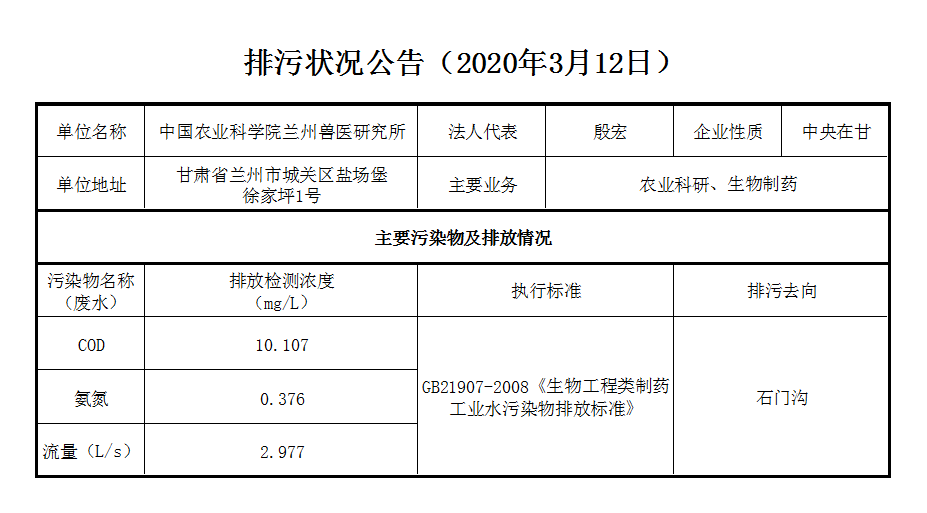 2020年3月12日污水排放监测数据公告