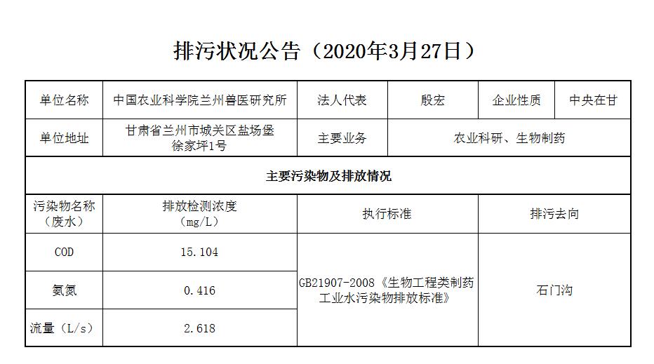 2020年3月27日污水排放监测数据公告