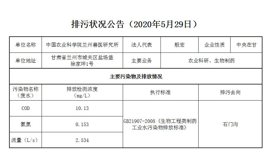2020年5月29日污水排放监测数据公告