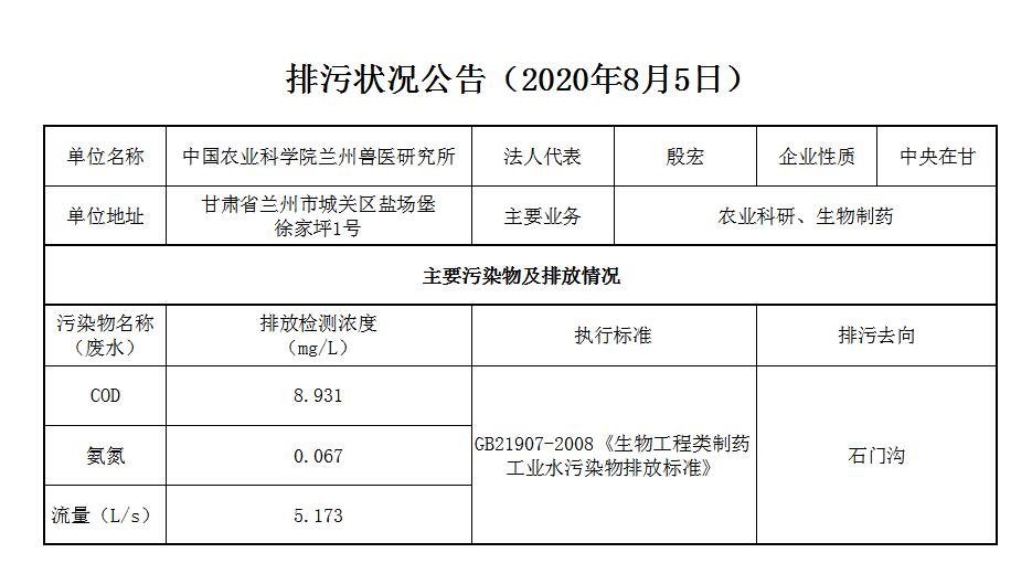 2020年8月5日污水排放监测数据公告