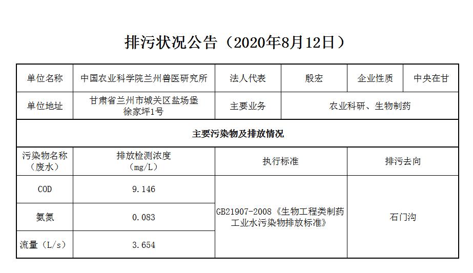 2020年8月12日污水排放监测数据公告