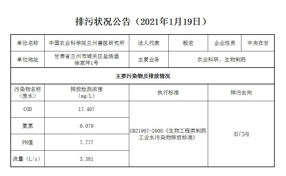 2021年1月19日污水排放监测数据公告
