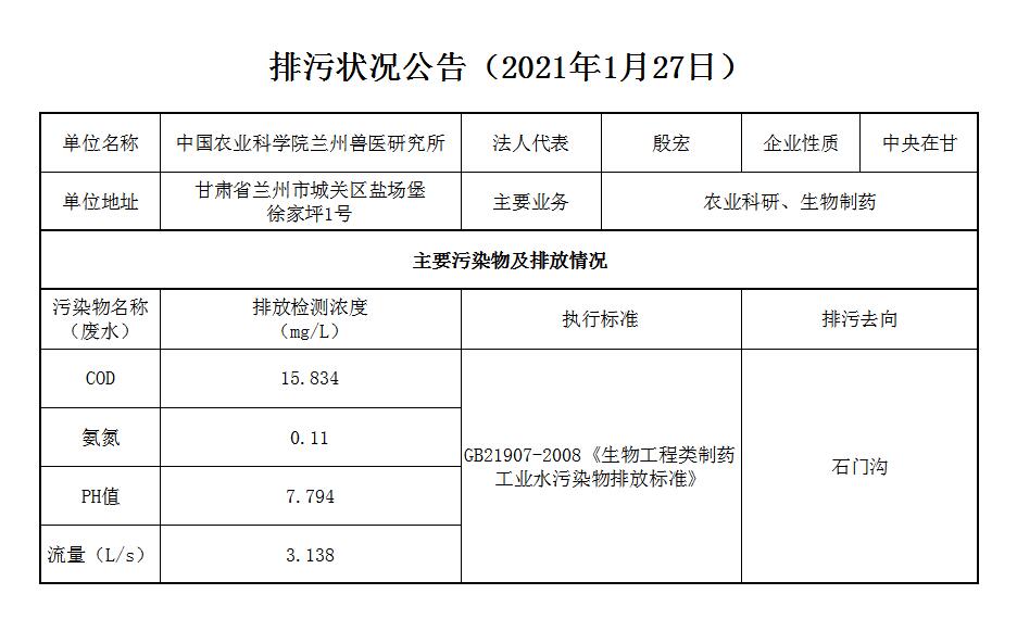 2021年1月27日污水排放监测数据公告