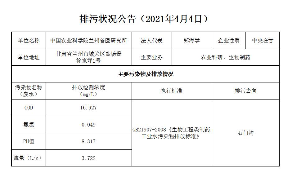 2021年4月4日污水排放监测数据公告