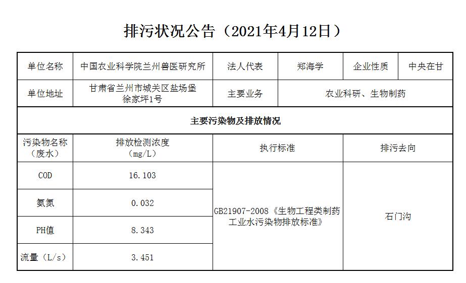 2021年4月12日污水排放监测数据公告