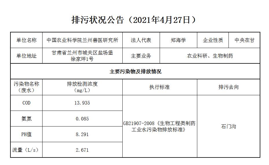 2021年4月27日污水排放监测数据公告