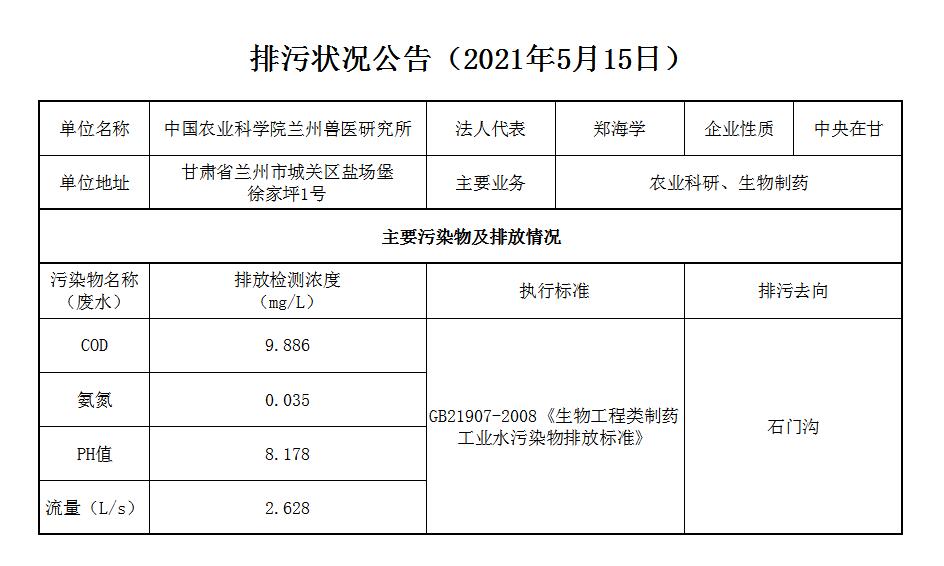 2021年5月15日污水排放监测数据公告