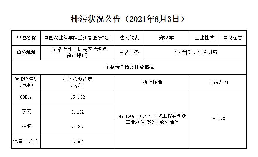 2021年8月3日污水排放监测数据公告