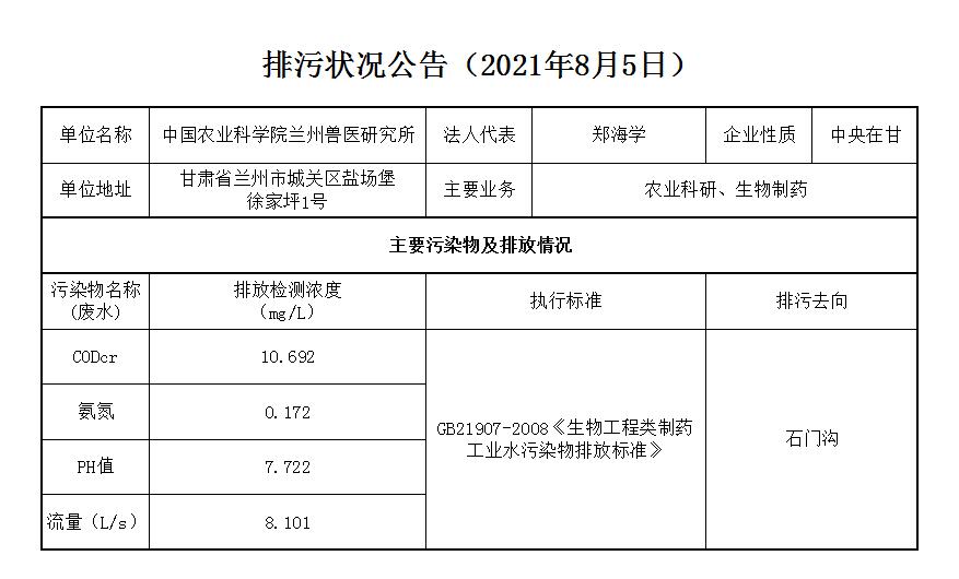 2021年8月5日污水排放监测数据公告