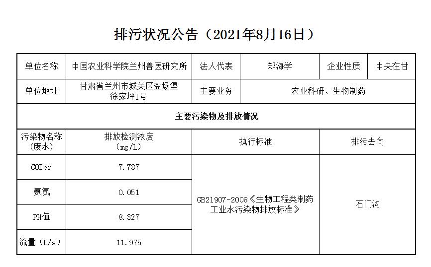 2021年8月16日污水排放监测数据公告