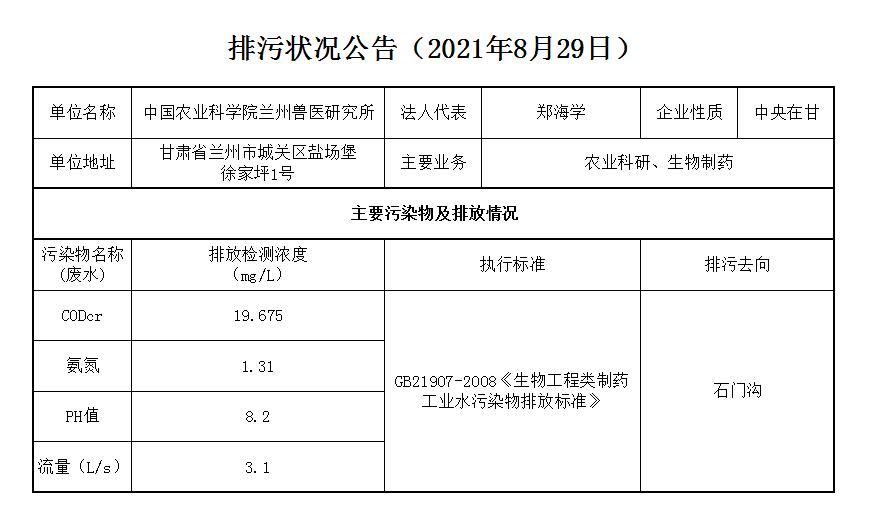2021年8月29日污水排放监测数据公告