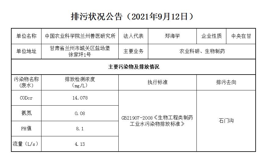 2021年9月12日污水排放监测数据公告