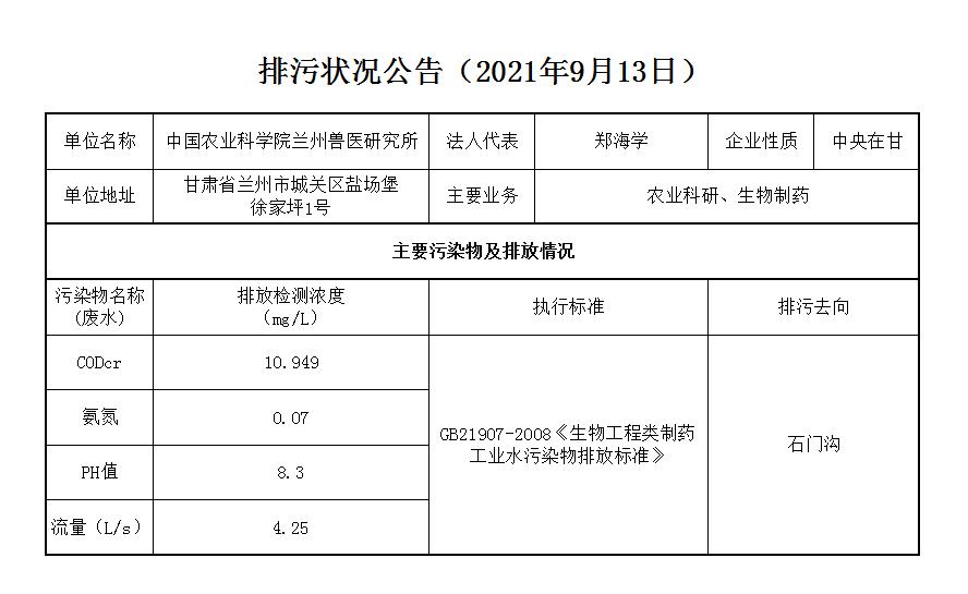 2021年9月13日污水排放监测数据公告