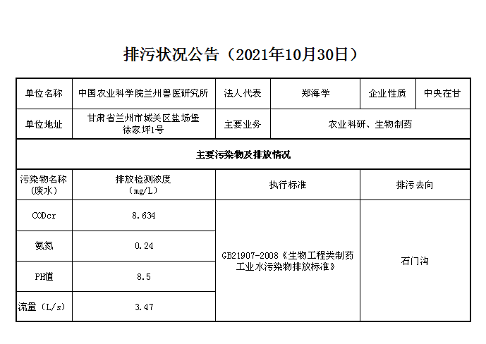 2021年10月30日污水排放监测数据公告