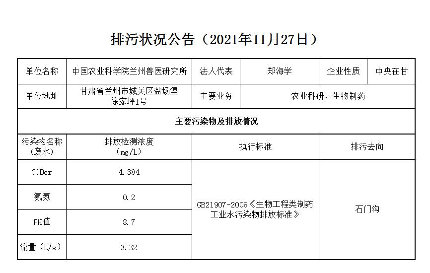 2021年11月27日污水排放监测数据公告