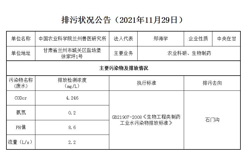 2021年11月29日污水排放监测数据公告