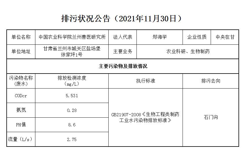 2021年11月30日污水排放监测数据公告